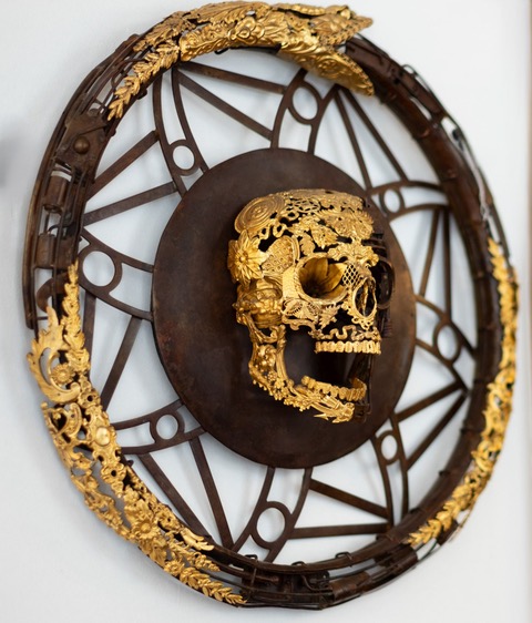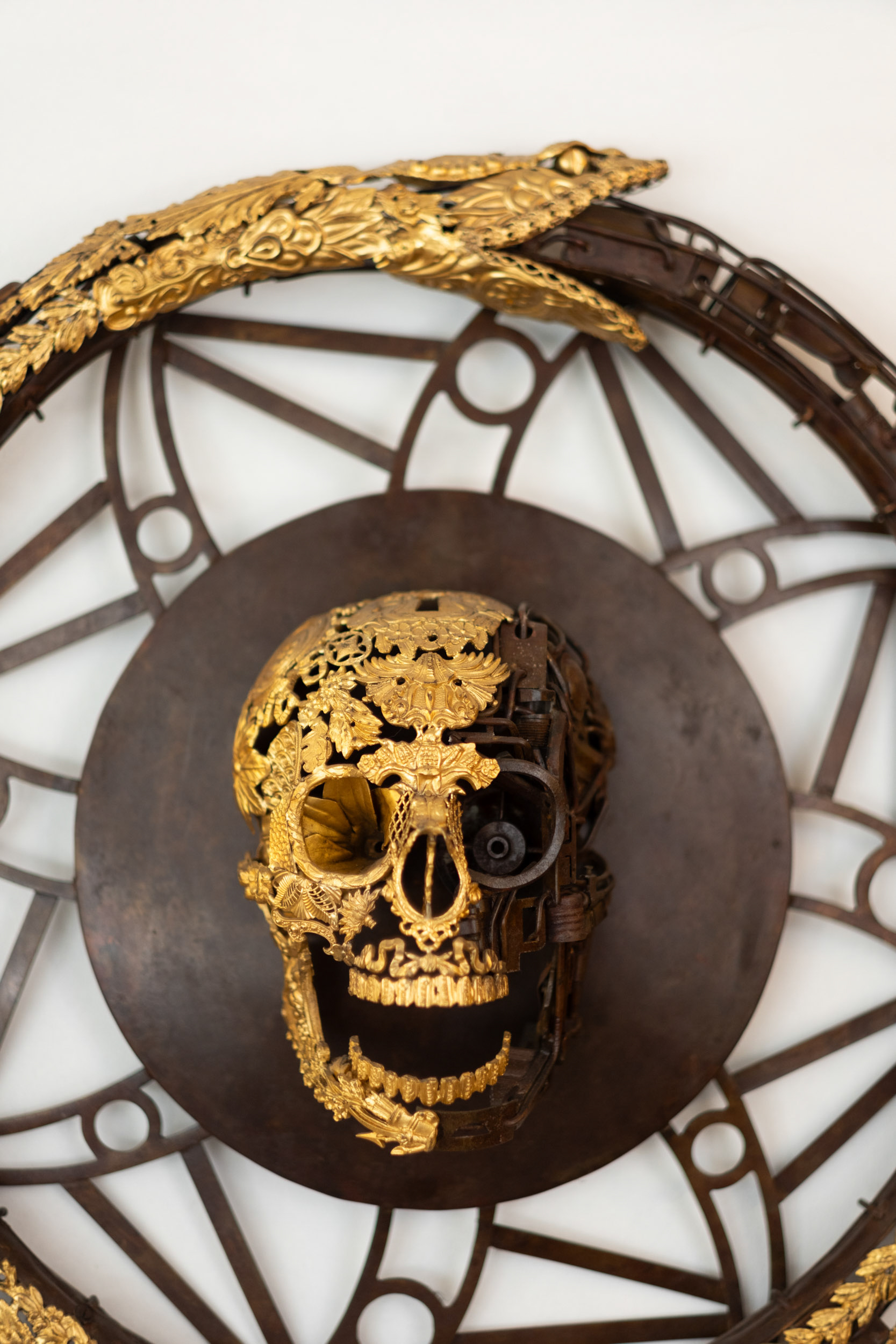 Sculpture Vanité au serpent, en bronze doré et à patine brune