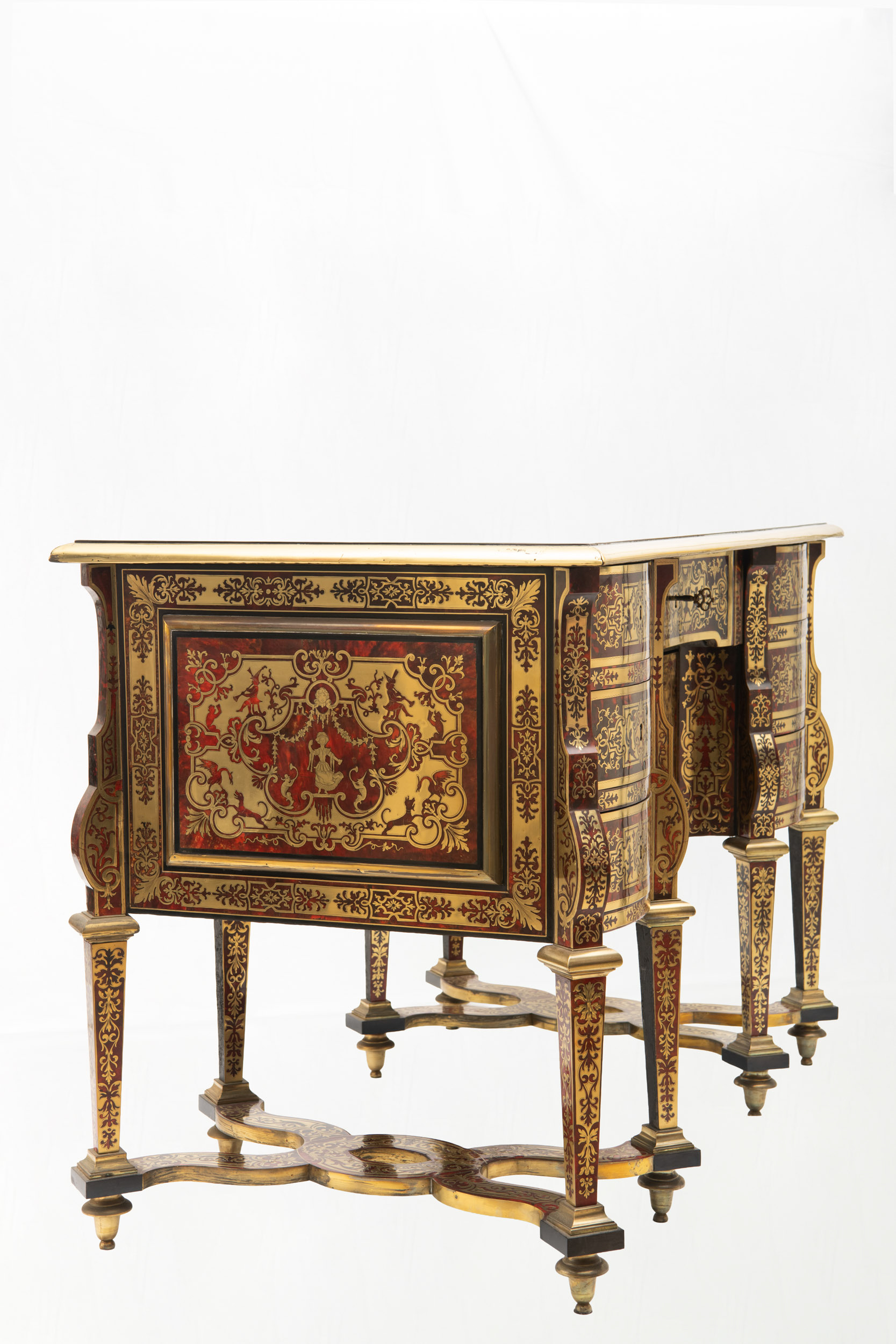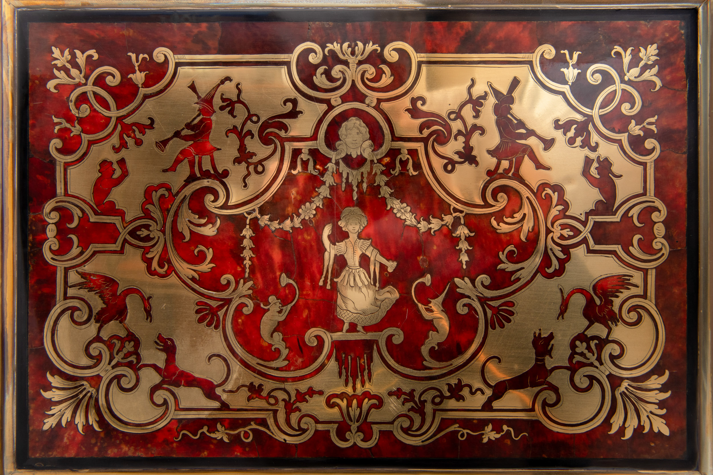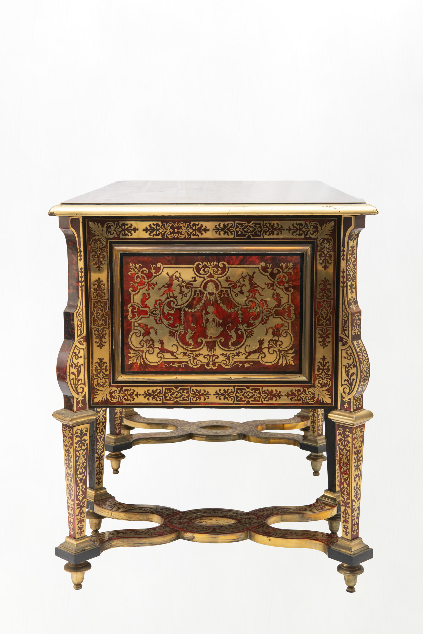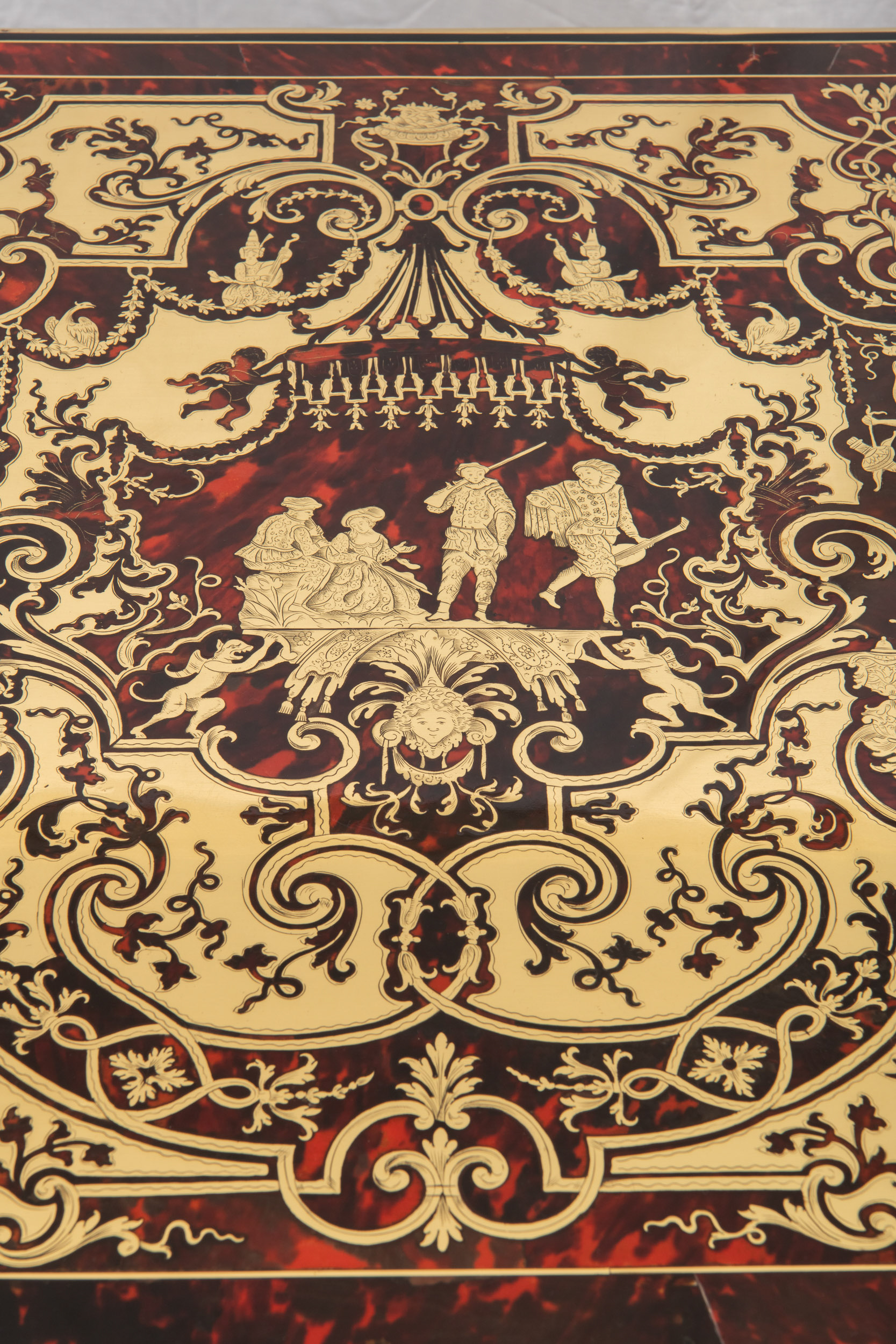 Bureau dit « Mazarin » en placage d’écaille de tortue teintée rouge et laiton marqueté à décor de saltimbanques, satyres et thermes féminins, dais d’oiseaux et papillons dans des encadrements de rinceaux feuillagés, palmettes, volutes….