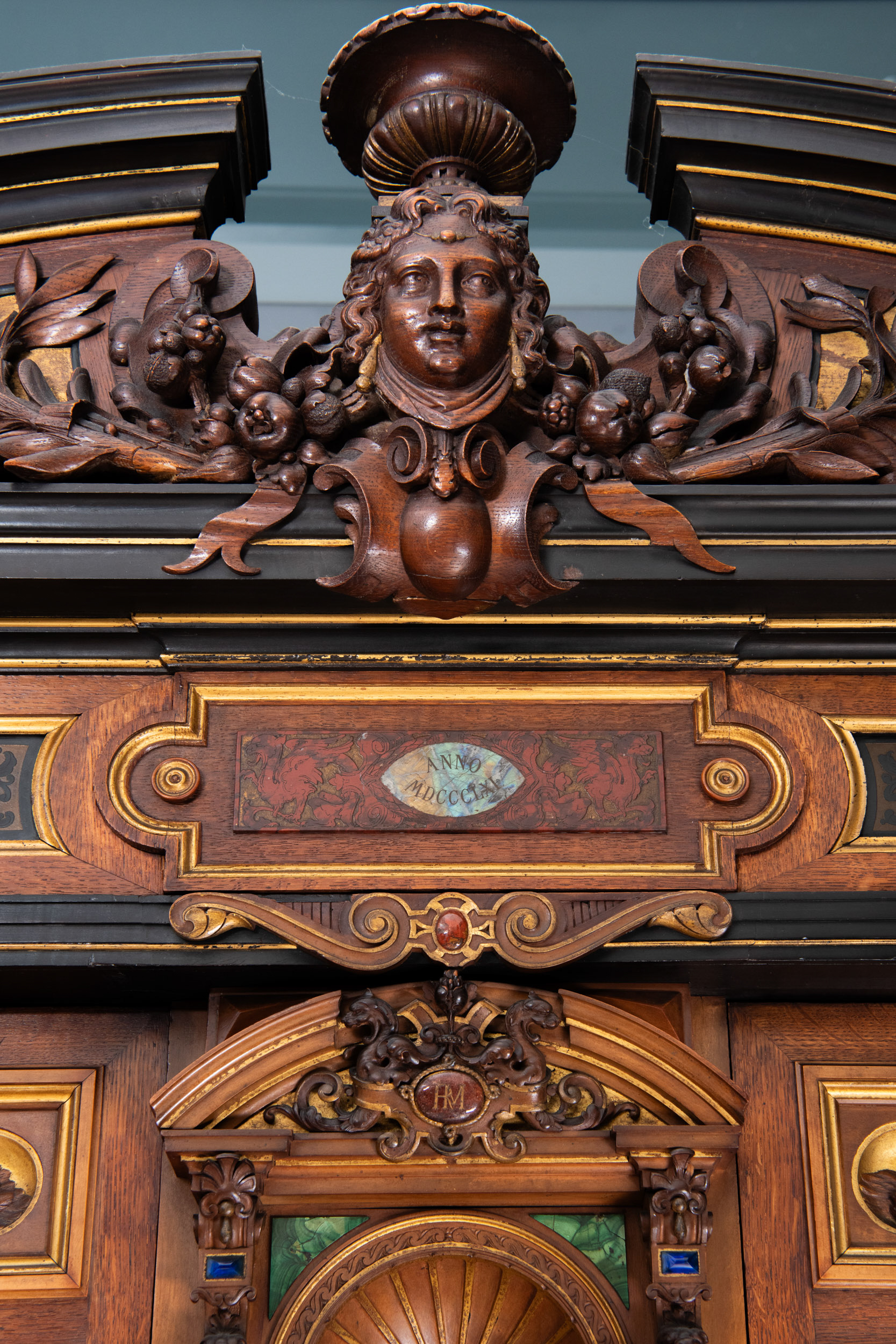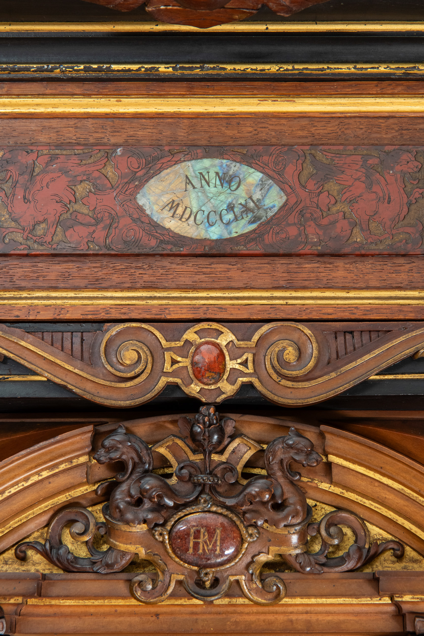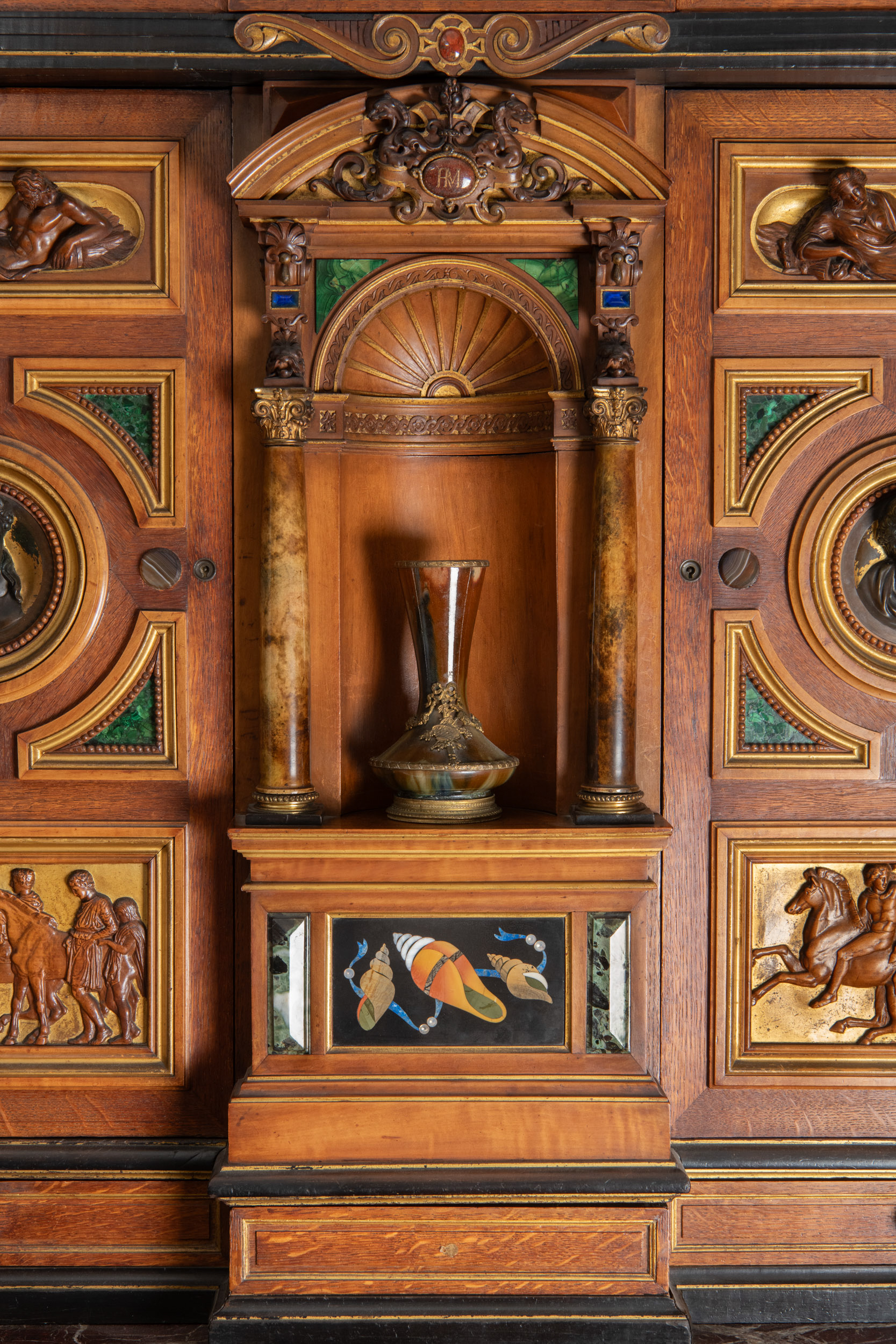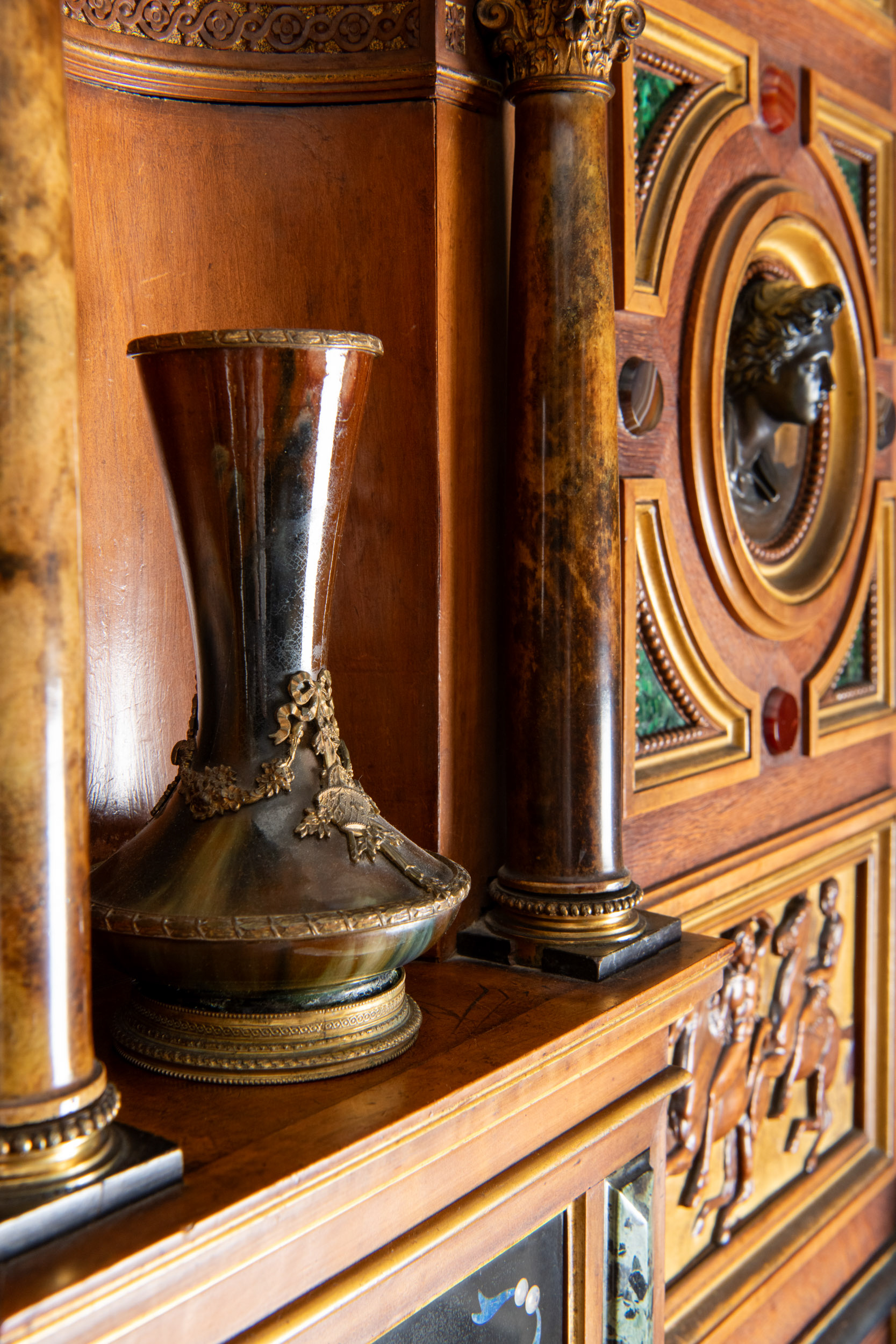 Très riche décor de styles composites néo-classique, néo-Renaissance, néo-baroque, le fronton centré d’un mascaron féminin sommé d’un vase Médicis, trois cartouches en marqueterie de marbre, la partie centrale portant la date 1861 dans une mandorle de nacre, la partie médiane richement ornée de bas et hauts reliefs à l’Antique de dieux fleuves, mascarons, palefreniers et courses de chevaux d’après les frises du Parthénon, tables d’attente de pierres dures, tableau de marqueterie de pietra dura figurant des conches et coquillages. En partie centrale une alcôve flanqué de colonnes à chapiteaux corinthiens et sommée d’un cartouche gravé du chiffe RM flanqué de chimères. Plateau de marbre rouge veiné blanc. En partie haute quatre tiroirs dont un secret et deux vantaux latéraux dévoilant chacun deux casiers et quatre tiroirs, et un volet secret en partie droite. Deux tiroirs dont un compartimenté et deux vantaux découvrant trois tiroirs en partie basse.