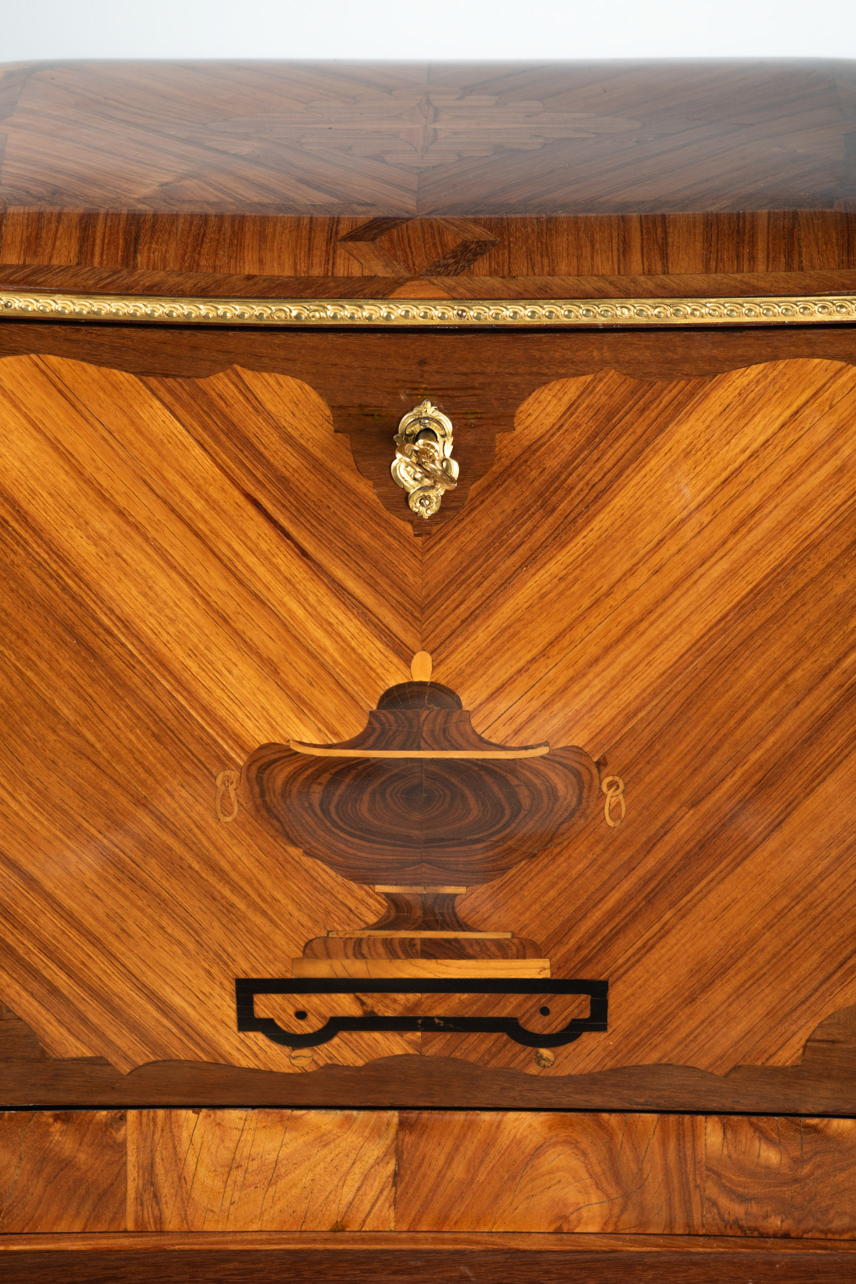 Bernard (II) Van Risen Burgh (c.1700-1766) (B.V.R.B.) fut reçu maître ébéniste avant 1730 et cessa son activité en 1764 lorsqu’il vendit son fonds de boutique à son fils Bernard (III) Van Risen Burgh. Celui-ci exerça jusque vers 1771-1772 reprenant l’estampille, B.V.R.B., de son père. Si B.V.R.B. reste communément le plus parfait représentant du goût rocaille, il céda néanmoins dès 1760 au dernier goût néoclassique. Le véritable initiateur de ce style fut le collectionneur d’art Ange-Laurent de La live de Jully et son dessinateur Le Lorrain qui lui créa en 1754-1755 tout un mobilier « composé dans le goût antique ». Le succès de ce mobilier fut tel, qu’il fut à l’origine d’un style nommé « à la grecque » qui s’empara de Paris de 1760 à 1765. En plein règne de Louis XV, le style « à la grecque » avait déjà toutes les caractéristiques du futur style Louis XVI. C’est vers 1740-1745 que B.V.R.B. commença à pratiquer la marqueterie de fleurs, mettant au point une manière qui lui était particulière, associant des fleurs en bois de violette scié « de bout » se détachant sur fond « de fil » de bois de rose, le tout sur contrefont en amarante. Ici, B.V.R.B. conserve toujours la même technique, mais associe un vase totalement néoclassique. L’originalité de conception et la précocité stylistique de notre meuble ne peuvent être comprises qu’à travers l’intervention d’un marchand mercier, qui commanda l’exécution de ce meuble à B.V.R.B., le dirigea et lui fournit des dessins et des modèles. Il s’agit très certainement de Simon-Philippe Poirier, le grand marchand mercier de la capitale, qui faisait alors travailler B.V.R.B. et Joseph Baumhauer et qui utilisera quelques années plus tard Bernard (III) Van Risen Burgh. Le meuble ici présenté peut-être rapproché d’une série de serre-bijoux et de commodes estampillées B.V.R.B., datables vers 1755/1765, et attribuables soit à Bernard (II) soit à Bernard (III) Van Risen Burgh qui présentent des caractéristiques et un décor de vase antique similaires.